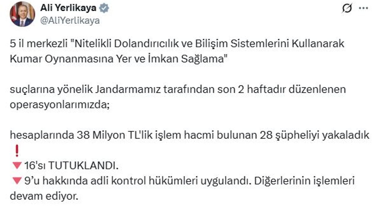 İçişleri Bakanı Ali Yerlikaya, jandarma tarafından son 2 haftadır düzenlenen operasyonu, sosyal medya hesabından paylaştı. Buna göre; 'Nitelikli dolandırıcılık' ve 'Bilişim sistemlerini kullanarak kumar oynanmasına yer ve imkan sağlama' suçlarına yönelik yapılan çalışmada, hesaplarında 38 milyon TL'lik işlem hacmi bulunan 28 şüpheli yakalandı. Şüphelilerin 16'sı tutuklanırken, 9'u hakkında adli kontrol hükümleri uygulandı. Diğerlerinin işlemleri ise devam ediyor.