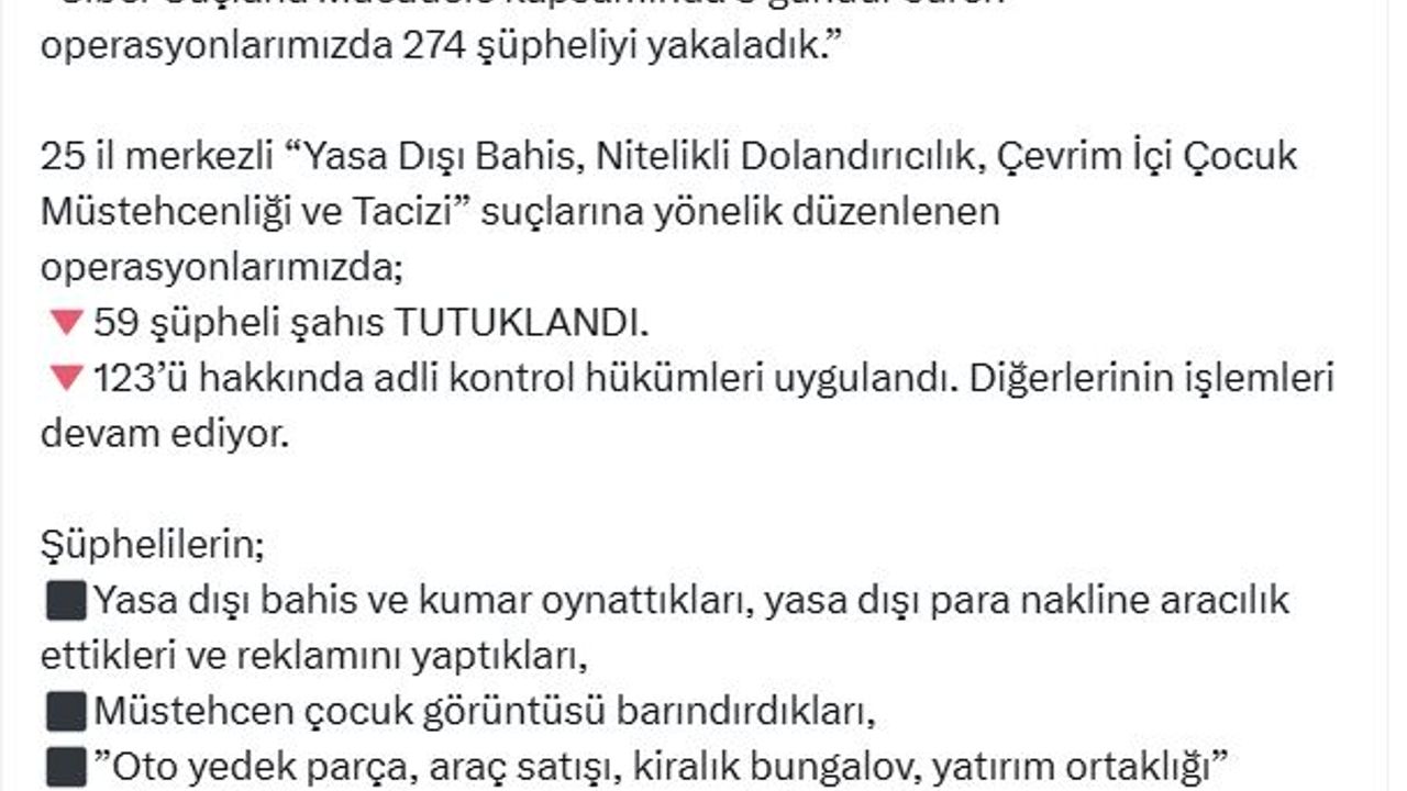 İçişleri Bakanı Ali Yerlikaya, polis tarafından düzenlenen ve 5 gün süren operasyonu, sosyal medya hesabından paylaştı. Buna göre; 25 ilde 'Yasa dışı bahis', 'Nitelikli dolandırıcılık', 'Çevrim içi çocuk müstehcenliği ve tacizi' suçlarına yönelik düzenlenen operasyonda 274 şüpheli yakalandı. Operasyon sonucu 10 soğuk cüzdan ile piyasa değeri yaklaşık 73 milyon TL olan 7 taşıt ile 7 tapuya el konuldu.