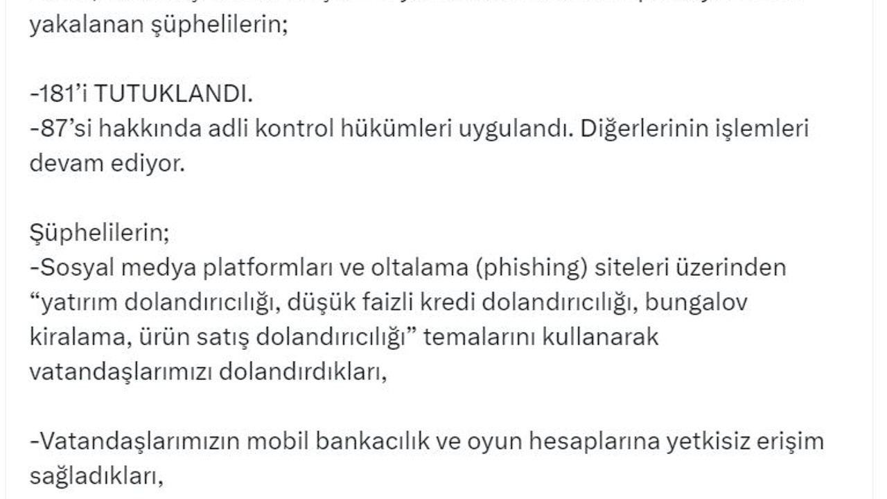 'Şüphelilerin; sosyal medya platformları ve oltalama (phishing) siteleri üzerinden 'yatırım dolandırıcılığı, düşük faizli kredi dolandırıcılığı, bungalov kiralama, ürün satış dolandırıcılığı' temalarını kullanarak vatandaşlarımızı dolandırdıkları, vatandaşlarımızın mobil bankacılık ve oyun hesaplarına yetkisiz erişim sağladıkları, yasa dışı bahis ve kumar oynattıkları, yasa dışı bahis sitelerinde para nakline aracılık ettikleri ve reklamını yaptıkları, POS tefeciliği yaptıkları, müstehcen çocuk görüntüsü barındırdıkları, kişisel verilerin paylaşımı ve sorgulama konularında paylaşımlar yaptıkları tespit edildi. Operasyonlar sonucu şüphelilere ait suçtan elde edildiği değerlendirilen; 3 adet şirket, 1 adet futbol kulübü, 11 adet araç, 3 adet motosiklet, 7 adet daire, 6 adet arsa ve 1 adet iş yeri olmak üzere yaklaşık 210 milyon TL değerinde mal varlığına el konuldu. Siber suç ve suçlularla mücadelemiz kararlılıkla devam edecektir. Emeği geçenleri tebrik ediyoruz.' (DHA)
