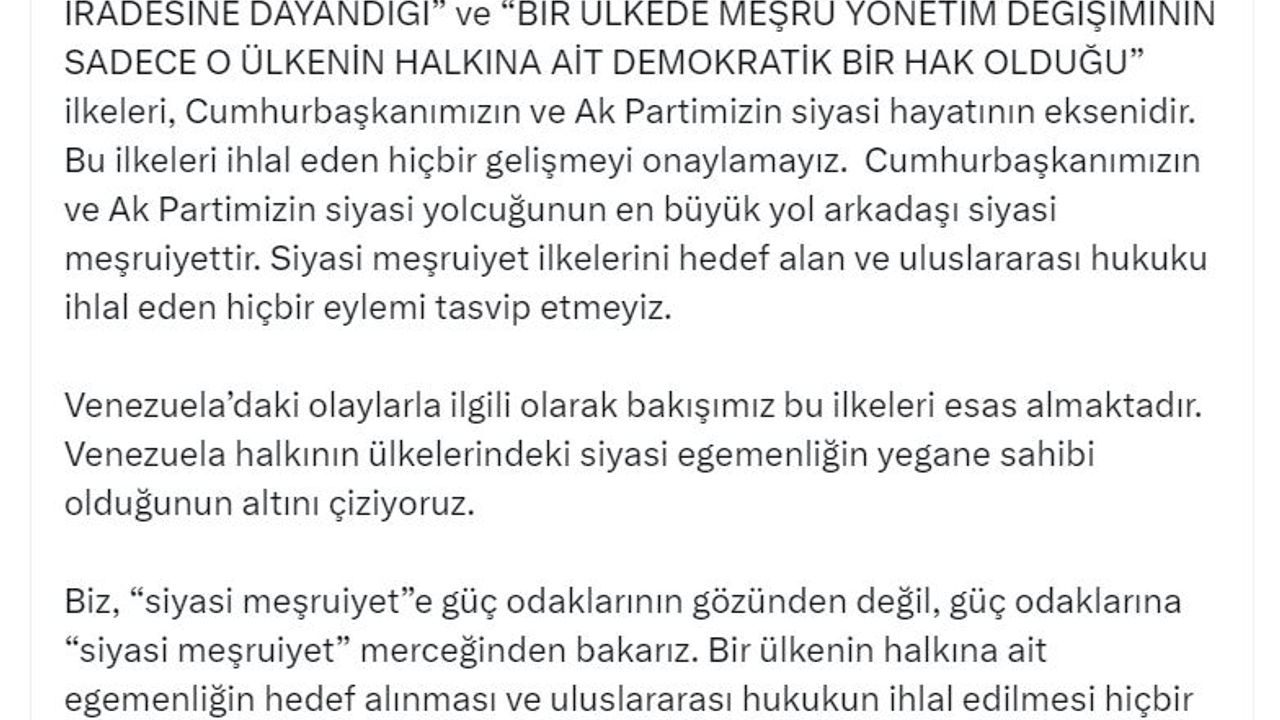AK Parti Sözcüsü Çelik, sanal medya hesabından yaptığı açıklamada, 'Sayın Cumhurbaşkanımız ve AK Partimiz her zaman uluslararası hukukun, ülkelerin meşru egemenliğinin ve toprak bütünlüğünün savunucusu olmuştur. 'Yönetimlerin meşruiyetinin halk iradesine dayandığı' ve 'Bir ülkede meşru yönetim değişiminin sadece o ülkenin halkına ait demokratik bir hak olduğu' ilkeleri, Cumhurbaşkanımızın ve AK Partimizin siyasi hayatının eksenidir. Bu ilkeleri ihlal eden hiçbir gelişmeyi onaylamayız. Cumhurbaşkanımızın ve AK Parti'mizin siyasi yolcuğunun en büyük yol arkadaşı siyasi meşruiyettir. Siyasi meşruiyet ilkelerini hedef alan ve uluslararası hukuku ihlal eden hiçbir eylemi tasvip etmeyiz. Venezuela'daki olaylarla ilgili olarak bakışımız bu ilkeleri esas almaktadır. Venezuela halkının ülkelerindeki siyasi egemenliğin yegane sahibi olduğunun altını çiziyoruz. Biz, 'siyasi meşruiyet'e güç odaklarının gözünden değil, güç odaklarına 'siyasi meşruiyet' merceğinden bakarız. Bir ülkenin halkına ait egemenliğin hedef alınması ve uluslararası hukukun ihlal edilmesi hiçbir şekilde kabul edilemez. Bir ülkenin 'siyasi tapusu' sadece ve sadece o ülkenin halkına aittir. 'Meşru egemenlik' sadece o ülkenin halkının inşa edeceği bir iradedir; dışardan dayatılamaz. Uluslararası düzenin ve uluslararası hukukun varlığı da bunun için gereklidir. Cumhurbaşkanımız bu prensiplerin en güçlü savunucusudur' ifadelerini kullandı.