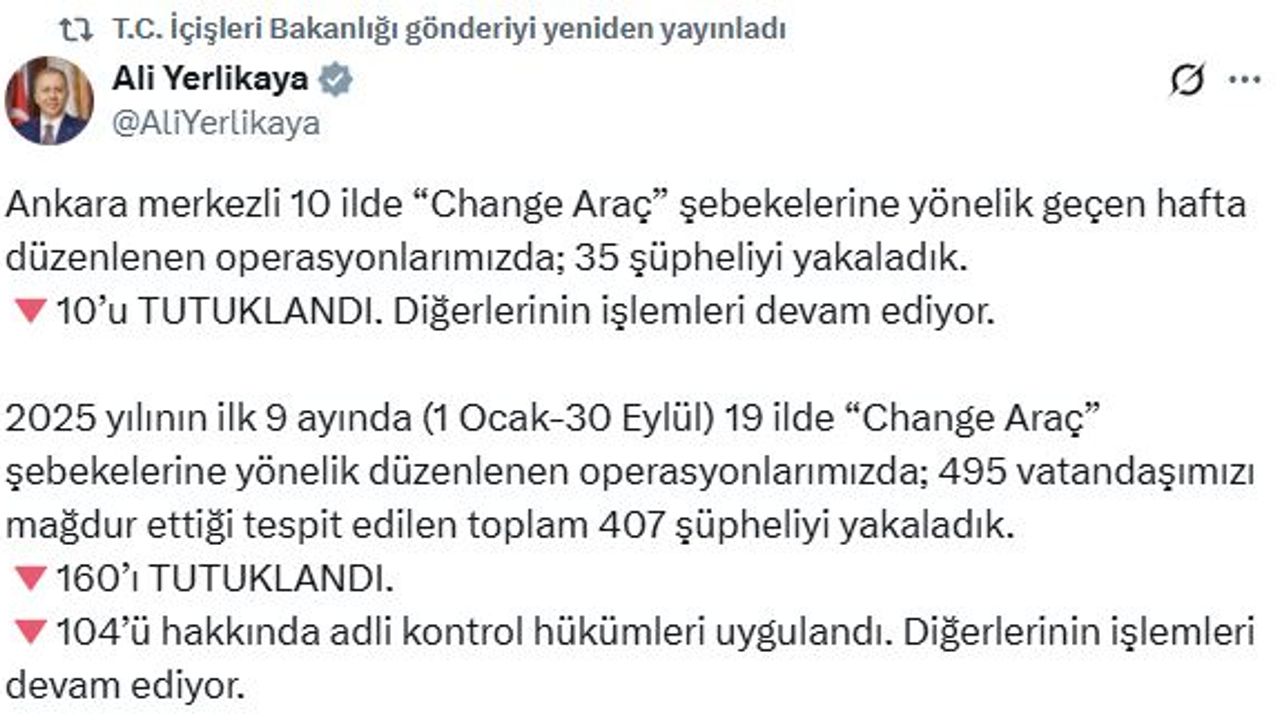 İçişleri Bakanı Ali Yerlikaya, hasarlı araçların şasi ve motor numaralarını hacizli, çalıntı ve kaçak araçlara kopyalayarak satışını yapan 'Change araç' şebekesine yönelik düzenlenen operasyonu sosyal medya hesabından paylaştı. Buna göre, 'Change araç' şebekelerine yönelik geçen hafta düzenlenen operasyonlarda 35 şüpheli yakalandı, bunlardan 10'u tutuklandı ve diğerlerinin işlemlerinin devam ediyor.