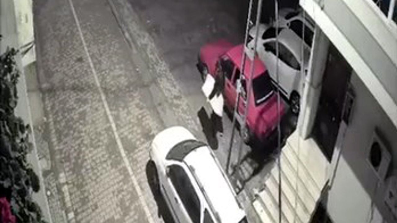 Araç sahibi güvenlik kamerası kayıtlarını inceledikten sonra hırsızlığı fark etti. Hırsızlık anları ise, güvenlik kamerası kayıtlarına yansıdı.