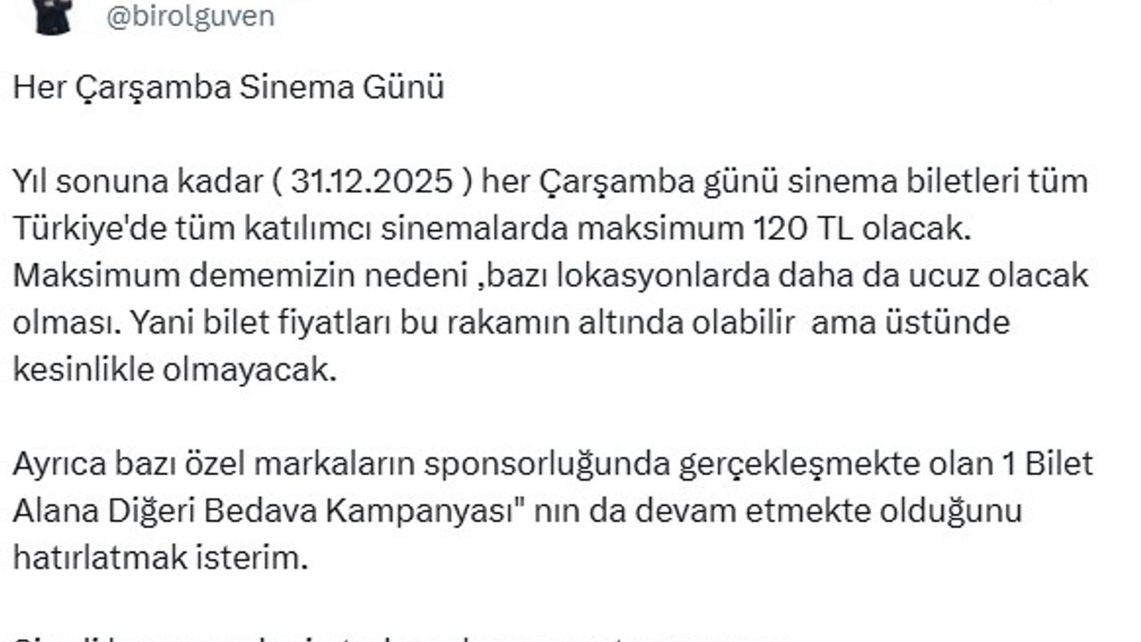 Sinema Genel Müdürü Birol Güven, sosyal medya hesabından yaptığı paylaşımda yıl sonuna kadar her çarşamba sinema biletlerinin maksimum 120 TL olacağını duyurdu. Güven, "Yıl sonuna kadar (31 Aralık 2025) her çarşamba günü sinema biletleri tüm Türkiye'de, tüm katılımcı sinemalarda maksimum 120 TL olacak. Maksimum dememizin nedeni bazı lokasyonlarda daha da ucuz olacak olması. Yani bilet fiyatları bu rakamın altında olabilir ama üstünde kesinlikle olmayacak. Ayrıca bazı özel markaların sponsorluğunda gerçekleşmekte olan '1 Bilet Alana Diğeri Bedava Kampanyası'nın da devam etmekte olduğunu hatırlatmak isterim. Şimdi beyaz perdenin tadını çıkarmanın tam zamanı" ifadelerini kullandı. (DHA)