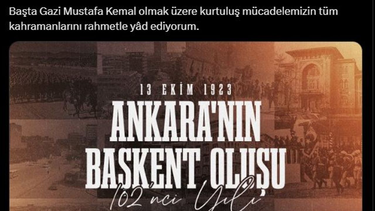 Cumhurbaşkanı Recep Tayyip Erdoğan, sosyal medya hesabından yaptığı paylaşımda, "Milli Mücadele'mizin karargahı olan, Büyük Zafer’e giden yolda tarihi bir rol oynayan Ankara’mızın başkent ilan edilişinin 102’nci yılını tebrik ediyorum. Başta Gazi Mustafa Kemal olmak üzere kurtuluş mücadelemizin tüm kahramanlarını rahmetle yad ediyorum" ifadelerini kullandı. (DHA)