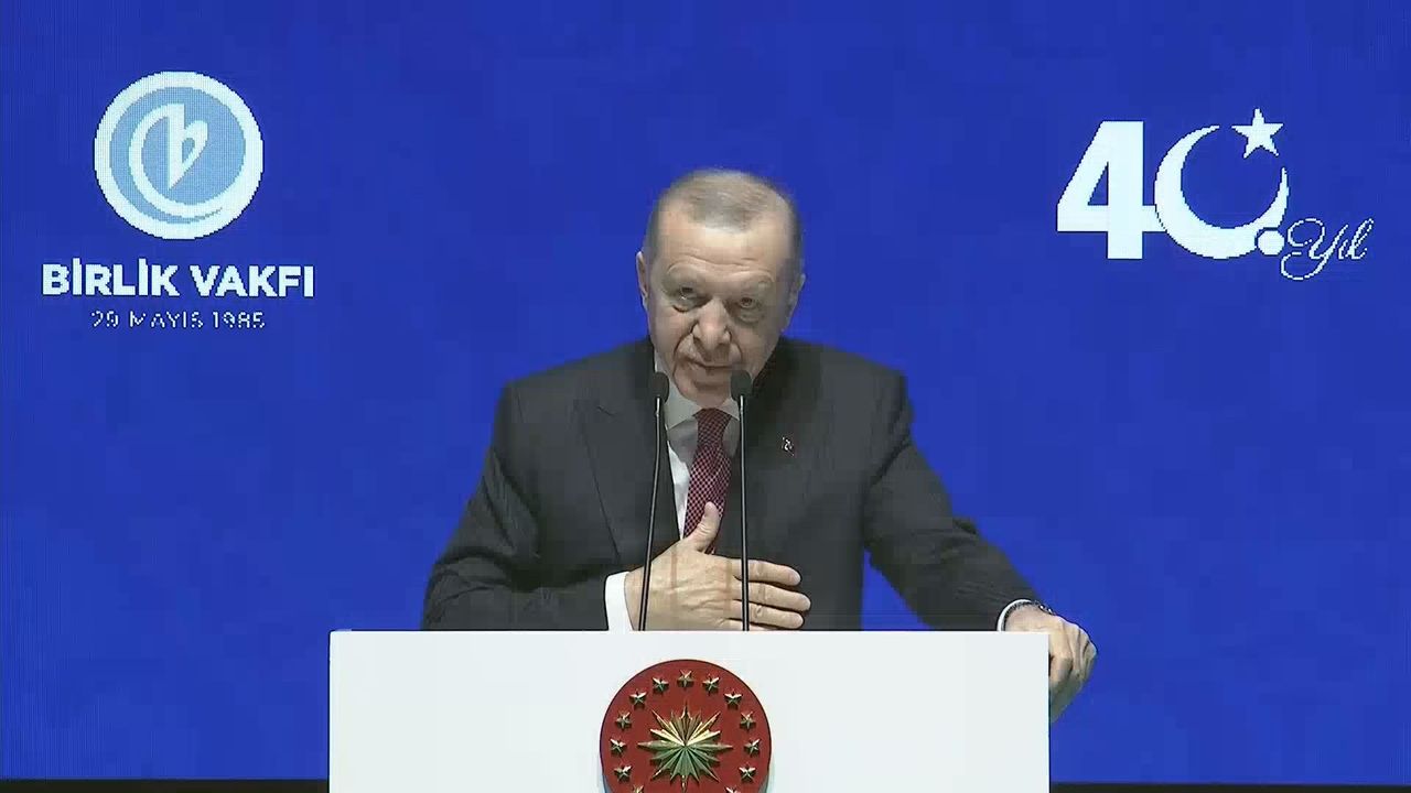 Cumhurbaşkanı Erdoğan, 'Bir defa şunu büyük bir bahtiyarlıkla ifade etmek istiyorum. Şahsımın da kurucuları arasında yer aldığı Birlik Vakfı, özellikle eğitim ve kültür alanında 40 yıldır mühim bir misyonu hamdolsun başarıyla yerine getiriyor. 50 ilimizdeki 55 şubesiyle barınma hizmetlerinden burs desteklerine, bilim, kültür ve sanat faaliyetlerinden yabancı dil kurslarına oldukça geniş bir yelpazede gençlerimizin elinden tutuyor, onları yarınlara hazırlıyor, istikbalimizin güvencesi olan genç arkadaşlarımıza rehberlik ediyor. Konferanslarıyla, panelleriyle, matbu ve dijital yayın faaliyetleriyle, farklı ihtisas alanlarındaki 20'yi aşkın komisyonuyla Birlik Vakfımız ilim, kültür ve irfan hazinemizi maziden atiye ulaştırıyor. Buradaki arkadaşlarımız milli ve manevi değerlerine sıkı sıkıya sarılan, bilgisiyle, eğitimiyle, ufku ve karakteriyle karanlıklar içinde ışıl ışıl parlayan bir gençliğin yetişmesi için 40 yıldır elinden geleni yapıyor. Vakfımızın niyeti hayır olduğu için hamdolsun cehdi de, emeği de, gayreti de hayırlı neticelerle taçlanıyor. Merkezinde birlik anlayışının yer aldığı bu ocaktan yetişen kardeşlerimiz bugün siyasetten iş hayatına, akademiden bürokrasiye her alanda Türkiye'ye alınlarının akıyla hizmet ediyor. Tüm zorluklara, tüm sıkıntılara rağmen, 29 Mayıs 1985'ten beri tekerleğin tümsekte kalmasını bekleyenlere rağmen bütün bu hizmetleri yaptık, yapıyoruz, Rabbim ömür verdikçe de yapmaya devam edeceğiz' dedi.