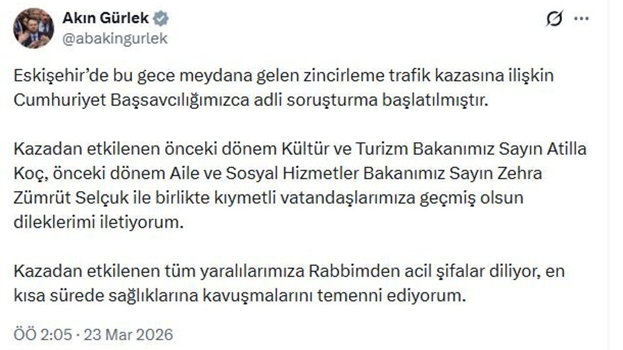 Bakan Gürlek, sanal medya üzerinden yaptığı paylaşımda, 'Eskişehir'de bu gece meydana gelen zincirleme trafik kazasına ilişkin Cumhuriyet Başsavcılığımızca adli soruşturma başlatılmıştır. Kazadan etkilenen önceki dönem Kültür ve Turizm Bakanımız Sayın Atilla Koç, önceki dönem Aile ve Sosyal Hizmetler Bakanımız Sayın Zehra Zümrüt Selçuk ile birlikte kıymetli vatandaşlarımıza geçmiş olsun dileklerimi iletiyorum. Kazadan etkilenen tüm yaralılarımıza Rabbimden acil şifalar diliyor, en kısa sürede sağlıklarına kavuşmalarını temenni ediyorum' ifadelerine yer verdi. (DHA)