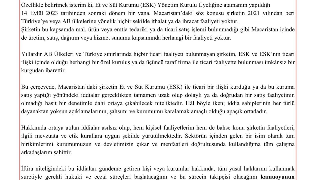 Öte yandan, konuyla ilgili açıklama yapan ESK Genel Müdürü ve Yönetim Kurulu Başkanı Mücahid Taylan, basın-yayın organlarında yer alan, kendisi ve Macaristan'da faaliyet gösterdiği iddia edilen bir şirketle ilgili ortaya atılan iddiaların gerçeği yansıtmadığını ifade etti. Taylan, 'Son günlerde bazı basın-yayın organlarında şahsım ve Macaristan'da mukim şirket hakkında gerçeği yansıtmayan çeşitli iddialara yer verildiği görülmüştür. Kamuoyunun doğru bilgilendirilmesi amacıyla bu açıklamayı yapma gereği hasıl olmuştur. Özellikle belirtmek isterim ki Et ve Süt Kurumu (ESK) Yönetim Kurulu Üyeliğine atamamın yapıldığı 14 Eylül 2023 tarihinden sonraki dönem bir yana, Macaristan'daki söz konusu şirketin 2021 yılından beri Türkiye'ye veya AB ülkelerine yönelik hiçbir şekilde ithalat ya da ihracat faaliyeti yoktur. Şirketin bu kapsamda mal, ürün veya emtia tedariki ya da ticari satış işlemi bulunmadığı gibi Macaristan içinde de üretim, satış, dağıtım veya hizmet sunumu kapsamında herhangi bir faaliyeti yoktur. Yıllardır AB ülkeleri ve Türkiye sınırlarında hiçbir ticari faaliyeti bulunmayan şirketin, ESK ve ESK'nin ticari ilişki içinde olduğu herhangi bir özel kuruluş ya da üçüncü taraf firma ile ticari faaliyette bulunması imkansız bir kurgudan ibarettir' dedi.