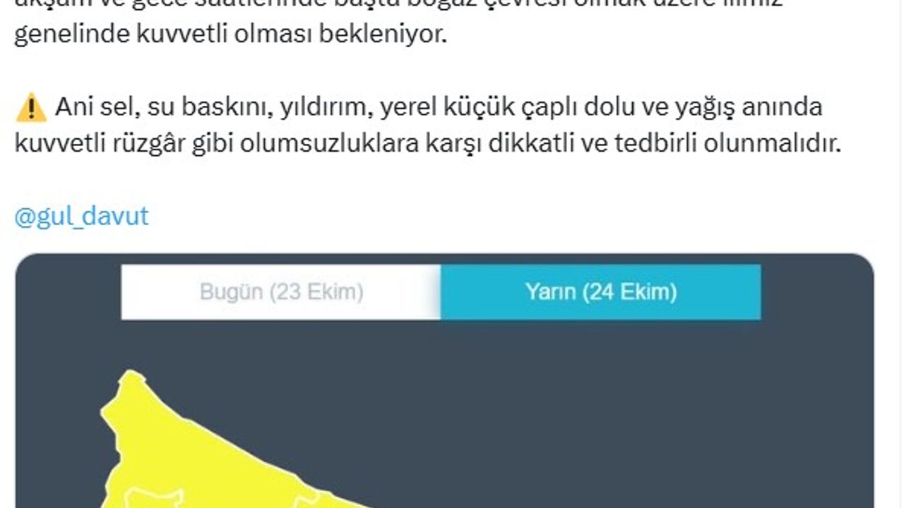 İstanbul Valiliği, Meteoroloji Genel Müdürlüğü'nden alınan raporun ardından kentin Avrupa Yakası için sarı kodlu sağanak yağış uyarısı yayınladı. Valiliğin sosyal medya hesabından yayınlanan uyarıda "Meteoroloji Genel Müdürlüğü'nün yaptığı son değerlendirmelere göre, Yarın (Cuma) öğle saatlerinden sonra 'İstanbul'un Avrupa Yakası'ndan' itibaren başlayacak olan gök gürültülü sağanak yağışların, akşam ve gece saatlerinde başta boğaz çevresi olmak üzere ilimiz genelinde kuvvetli olması bekleniyor. Ani sel, su baskını, yıldırım, yerel küçük çaplı dolu ve yağış anında kuvvetli rüzgâr gibi olumsuzluklara karşı dikkatli ve tedbirli olunmalıdır" ifadelerine yer verildi.