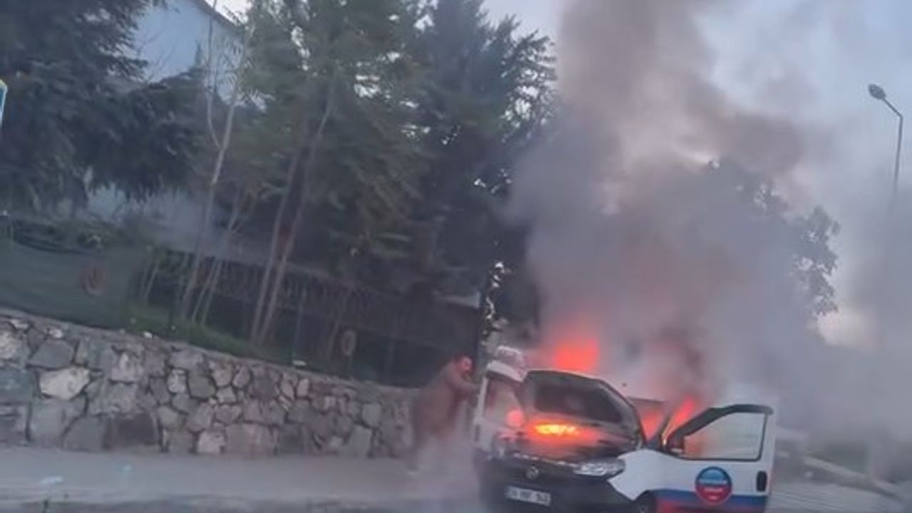 Sürücü, alevlere yangın söndürme tüpüyle müdahale etse de başarılı olamadı. O anlar cep telefonu ile görüntülendi.