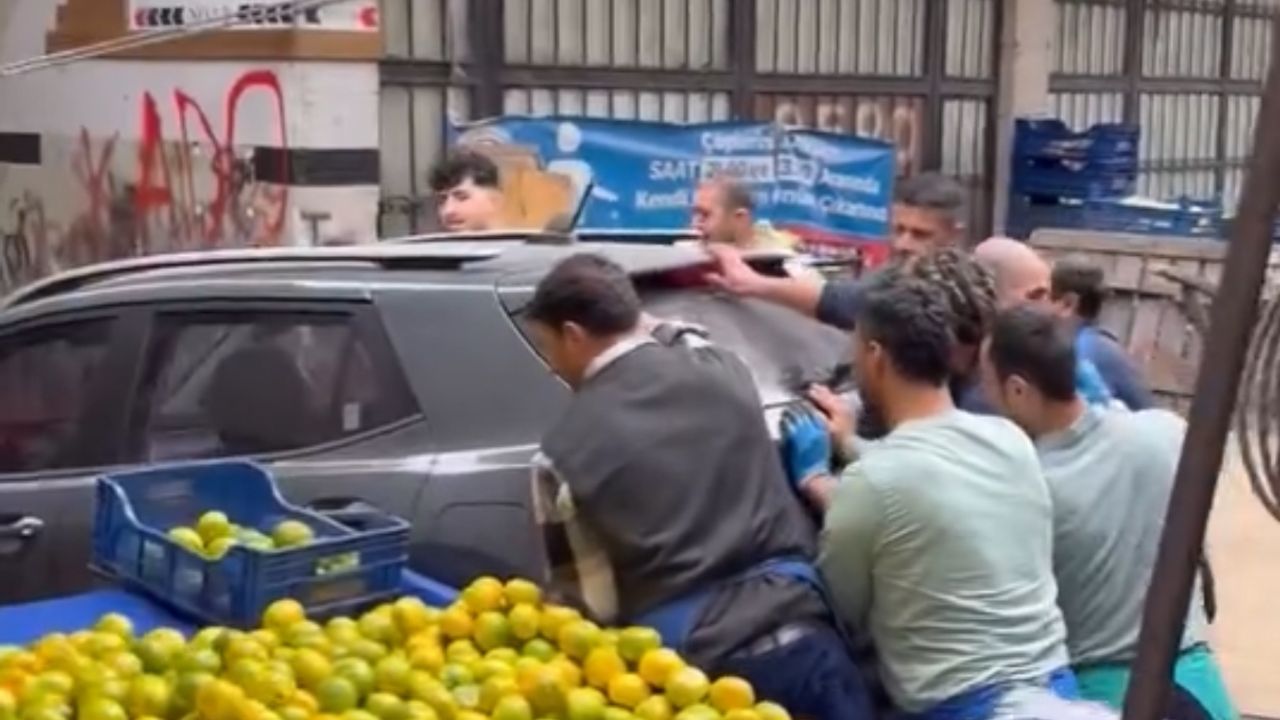 Otomobilin sahibine ulaşılamayınca, pazarcılar hep birlikte yan duran otomobili halat yardımıyla çevirip ittirerek karşı kaldırıma taşıdı. O anlar cep telefonu kamerasına yansıdı.