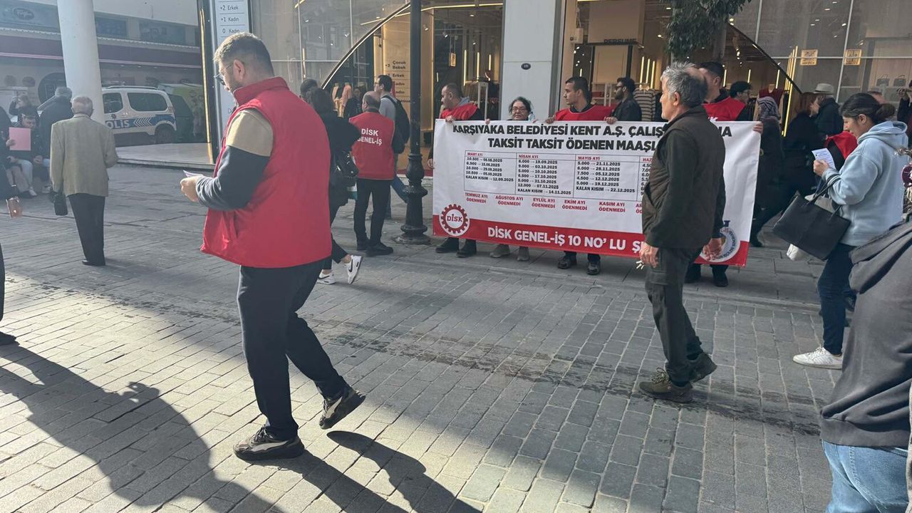 Karşıyaka Belediyesi iştiraki Kent A.Ş.'de çalışan işçiler, maaşlarını ve toplu sözleşmeden doğan farklarını alamadıkları gerekçesiyle yürüyüş yapıp, halka seslendi. Karşıyaka Çarşısı'nda halka bildiri dağıtan işçiler adına halka seslenen DİSK/Genel-İş İzmir 10 No'lu Şube Başkanı Ferit Akdoğan, 'Temmuz ayından bu yana 7 aylık maaşlarımız henüz ödenmedi. 2 yıl önceki TİS farklarımızı da alamadık. Haftalık 5-6 bin TL harçlık yatırılarak, biz emekçilerin hayatta kalması bekleniyor' dedi.