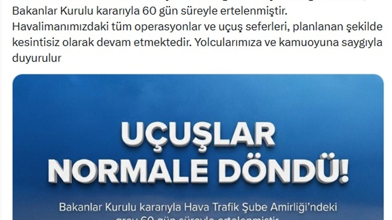 Konuyla ilgili olarak Ercan Havalimanı'nın sanal medya hesabından yapılan açıklamada, 'Ercan Havalimanı Hava Trafik Şube Amirliği'nde başlatılan grev süreci, Bakanlar Kurulu kararıyla 60 gün süreyle ertelenmiştir. Havalimanımızdaki tüm operasyonlar ve uçuş seferleri, planlanan şekilde kesintisiz olarak devam etmektedir. Yolcularımıza ve kamuoyuna saygıyla duyurulur' denildi.