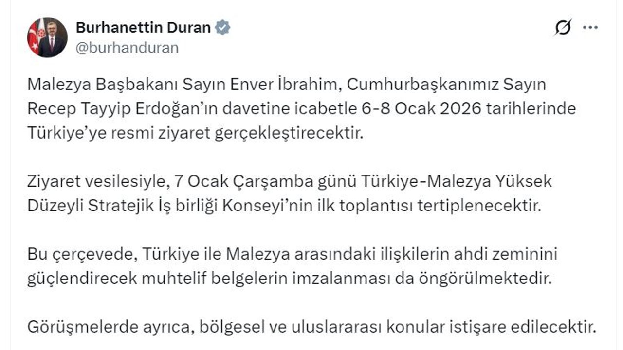 İletişim Başkanı Duran, sanal medya hesabından yaptığı açıklamada, 'Malezya Başbakanı Sayın Enver İbrahim, Cumhurbaşkanımız Sayın Recep Tayyip Erdoğan'ın davetine icabetle 6-8 Ocak 2026 tarihlerinde Türkiye'ye resmi ziyaret gerçekleştirecektir. Ziyaret vesilesiyle, 7 Ocak Çarşamba günü Türkiye-Malezya Yüksek Düzeyli Stratejik İş birliği Konseyi'nin ilk toplantısı tertiplenecektir. Bu çerçevede, Türkiye ile Malezya arasındaki ilişkilerin ahdi zeminini güçlendirecek muhtelif belgelerin imzalanması da öngörülmektedir. Görüşmelerde ayrıca, bölgesel ve uluslararası konular istişare edilecektir' dedi. (DHA)