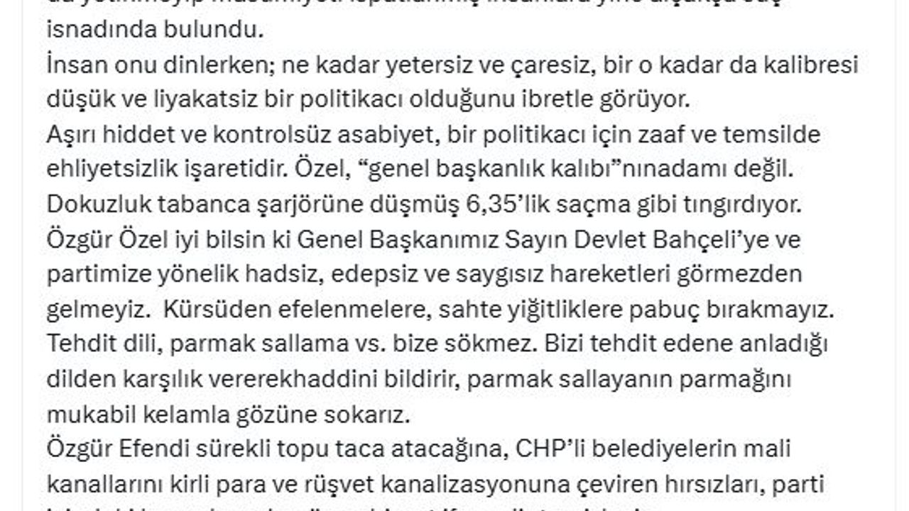 MHP'li Semih Yalçın, CHP Genel Başkanı Özgür Özel'in partisine yönelik açıklamalarına sosyal medya hesabından yanıt verdi. Yalçın, "Hadsiz Özgür Özel'e cevap. CHP'nin başı Özgür Özel kürsüde pürhiddet ve sinirden titreyerek konuşurken, MHP'ye parmak salladı. Üstelik tehdit dili kullandı. Bununla da yetinmeyip masumiyeti ispatlanmış insanlara yine alçakça suç isnadında bulundu. İnsan onu dinlerken; ne kadar yetersiz ve çaresiz, bir o kadar da kalibresi düşük ve liyakatsiz bir politikacı olduğunu ibretle görüyor. Aşırı hiddet ve kontrolsüz asabiyet, bir politikacı için zaaf ve temsilde ehliyetsizlik işaretidir. Özel, genel başkanlık kalıbının adamı değil. Dokuzluk tabanca şarjörüne düşmüş 6,35'lik saçma gibi tıngırdıyor" dedi.