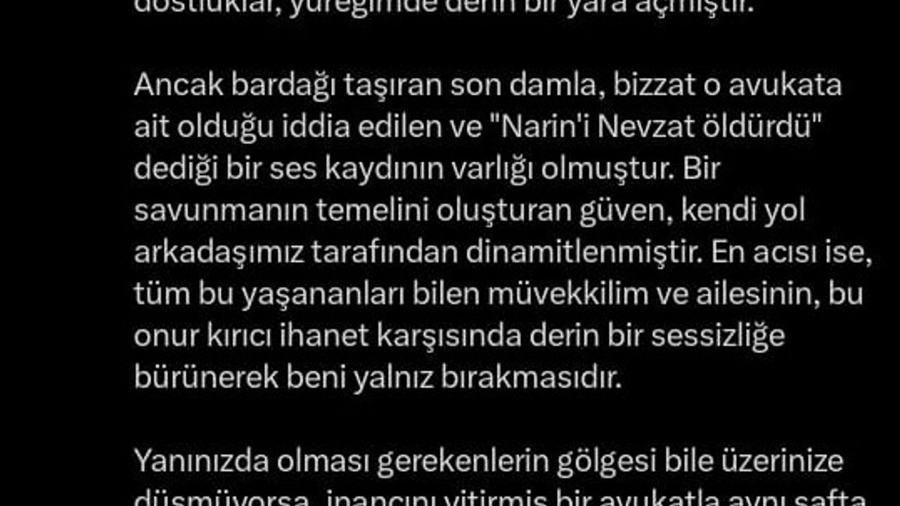 “Ancak bardağı taşıran son damla, bizzat o avukata ait olduğu iddia edilen ve ‘Narin'i Nevzat öldürdü’ dediği bir ses kaydının varlığı olmuştur. Bir savunmanın temelini oluşturan güven, kendi yol arkadaşımız tarafından dinamitlenmiştir. En acısı ise tüm bu yaşananları bilen müvekkilim ve ailesinin, bu onur kırıcı ihanet karşısında derin bir sessizliğe bürünerek beni yalnız bırakmasıdır. Yanınızda olması gerekenlerin gölgesi bile üzerinize düşmüyorsa, inancını yitirmiş bir avukatla aynı safta durmanız isteniyorsa ve en önemlisi, savunduğunuz kişinin masumiyetine dair şüphe bizzat ortağınız tarafından dile getiriliyorsa, o savaşta daha fazla kalınamaz. Ama Narin Davası'nda, Narin için yapmış olduğum ve yapacağım çalışmalarla elde ettiğim bilgiler doğrultusunda bir vatandaş olarak dışarıda kalan, yargılamalara dahil olmayan ya da başka suçlardan yargılanan suça karışan kişilerin de yargılanması için Diyarbakır Cumhuriyet Başsavcılığı'na ihbarlarda bulunmaya ve rahatsız etmeye devam edeceğim. Bu, bir pes ediş değil, hakikate ve meslek ve şahsi onuruma olan saygımın bir gereğidir. Saygılarımla.”