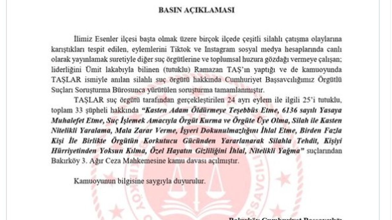 Bakırköy Cumhuriyet Başsavcılığı'nın X hesabından yapılan açıklamaya göre, 'İlimiz Esenler ilçesi başta olmak üzere birçok ilçede çeşitli silahlı çatışma olaylarına karıştıkları tespit edilen, eylemlerini Tiktok ve Instagram sosyal medya hesaplarından canlı olarak yayımlamak suretiyle diğer suç örgütlerine ve toplumsal huzura gözdağı vermeye çalışan; liderliğini Ümit lakabıyla bilinen (tutuklu) Ramazan TAŞ'ın yaptığı ve de kamuoyunda TAŞLAR ismiyle anılan silahlı suç örgütü hakkında Cumhuriyet Başsavcılığımız Örgütlü Suçlar Soruşturma Bürosunca yürütülen soruşturma tamamlanmıştır. TAŞLAR suç örgütü tarafından gerçekleştirilen 24 ayrı eylem ile ilgili 25'i tutuklu, toplam 33 şüpheli hakkında 'Kasten Adam Öldürmeye Teşebbüs Etme, 6136 sayılı Yasaya Muhalefet Etme, Suç İşlemek Amacıyla Örgüt Kurma ve Örgüte Üye Olma, Silahla Kasten Nitelikli Yaralama, Mala Zarar Verme, İşyerini Dokunulmazlığını İhlal Etme, Birden Fazla Kişi ile Birlikte Örgütün Korkutucu Gücünden Yararlanarak Silahla Tehdit, Kişiyi Hürriyetinden Yoksun Kılma, Özel Hayatın Gizliliğini İhlal, Nitelikli Yağma' suçlarından Bakırköy 3. Ağır Ceza Mahkemesine kamu davası açılmıştır' ifadeleri yer aldı. (DHA)