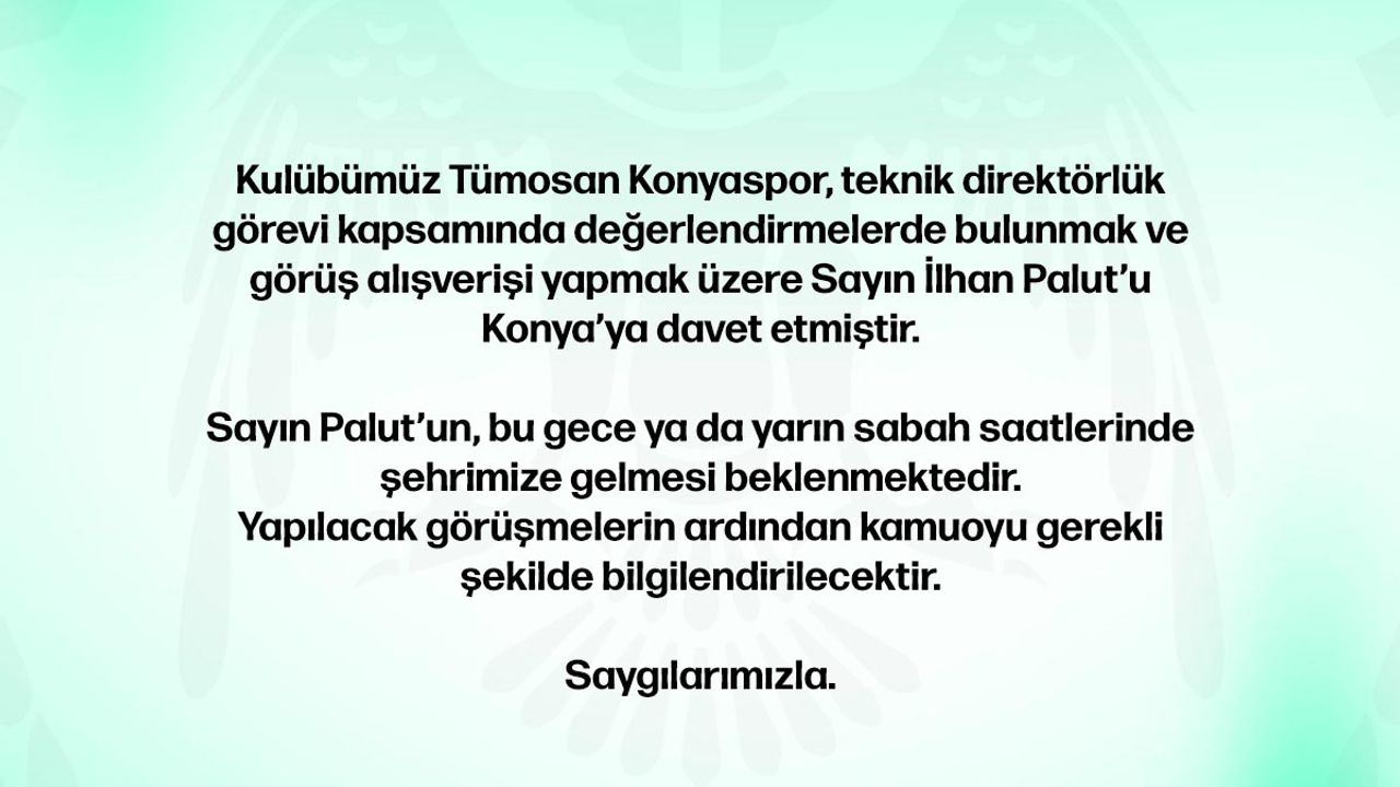 Yeşil- beyazlı yönetim, aralık ayında takımın başına getirdiği teknik direktör Çağdaş Atan ile dün yollarını ayırdı. Yerine ise 2021-2023 yılları arasında görev yapan teknik direktör İlhan Palut ile prensipte anlaştı. Konyaspor Basın Sözcüsü Cengiz Yönet, kulübün resmi sanal medya hesabından yaptığı açıklamada İlhan Palut'un, görüşme için Konya'ya davet edildiğini duyurdu. Açıklamada ''Kulübümüz Tümosan Konyaspor, teknik direktörlük görevi kapsamında değerlendirmelerde bulunmak ve görüş alışverişi yapmak üzere Sayın İlhan Palut'u Konya'ya davet etmiştir. Sayın Palut'un, bu gece ya da yarın sabah saatlerinde şehrimize gelmesi beklenmektedir. Yapılacak görüşmelerin ardından kamuoyu gerekli şekilde bilgilendirilecektir. ''denildi. (DHA)