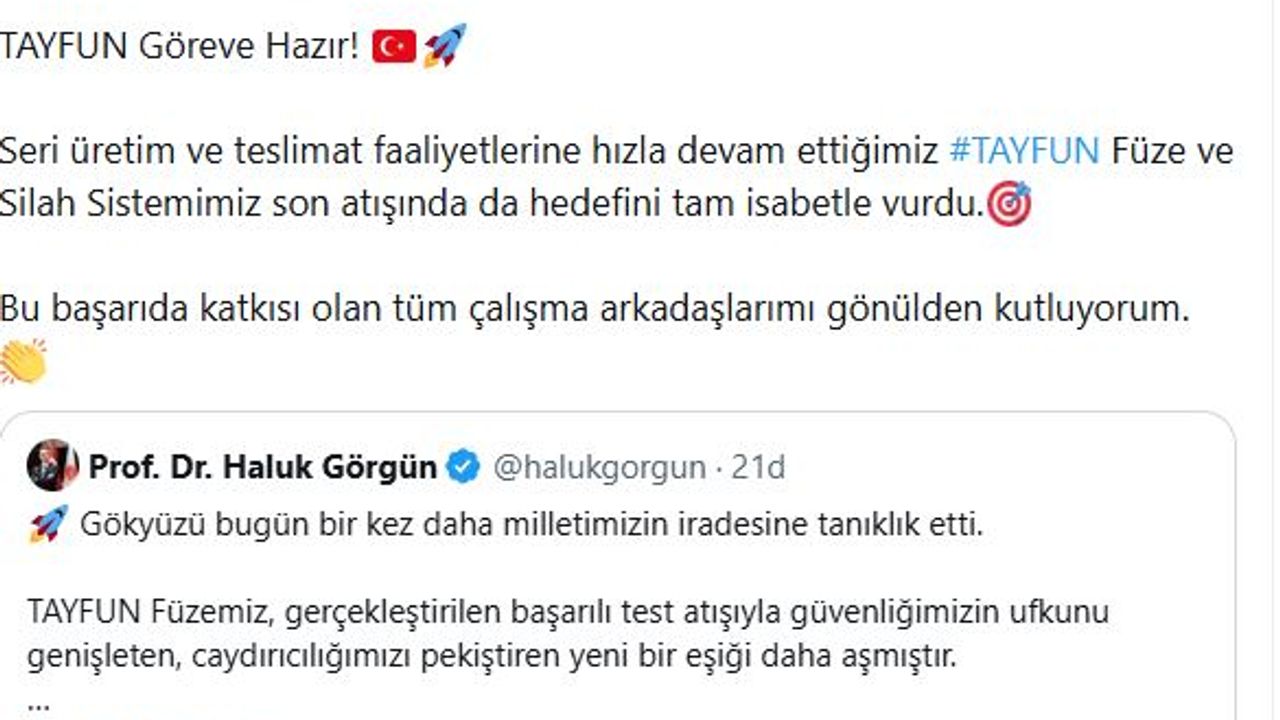 Savunma Sanayii Başkanı Haluk Görgün, 'Tayfun füzemiz, güvenliğimizin ufkunu genişleten, caydırıcılığımızı pekiştiren yeni bir eşiği daha aşmıştır' dedi.